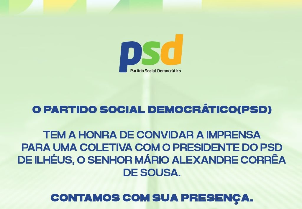 O PSD, Partido Social Democrático, tem a honra de convidar a imprensa para uma coletiva com o Presidente do PSD/ILHÉUS, Dr. Mário Alexandre Corrêa de Sousa. Venha participar deste momento importante e faça parte da construção política de nosso município. O QUE: Coletiva...