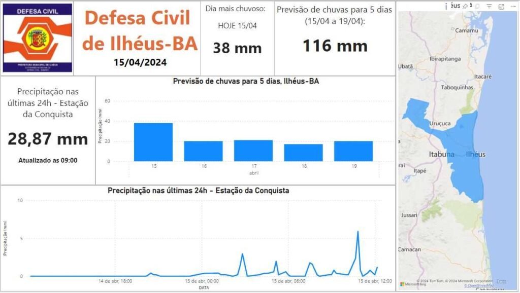 A Defesa Civil de Ilhéus alerta a população sobre a possibilidade de chuva intensa para a nossa região. A previsão é de que chova até 116 milímetros até o dia 19 de abril, de acordo com o INMET (Instituto Nacional de Meteorologia) e o CEMADEN (Centro Nacional de Monitoramento e Alertas de Desastres Naturais).