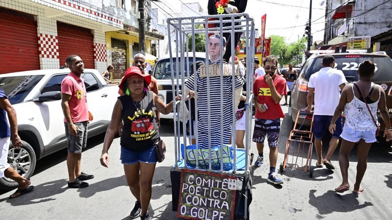 Entre os principais protestos realizados durante o evento, está uma onde o ex-presidente da República, Jair Bolsonaro (PL), aparece dentro de uma cadeira e uma placa diz ‘Comitê Poético Contra o Golpe’.