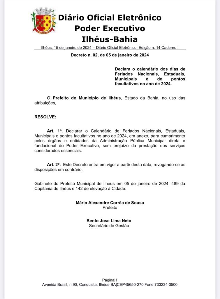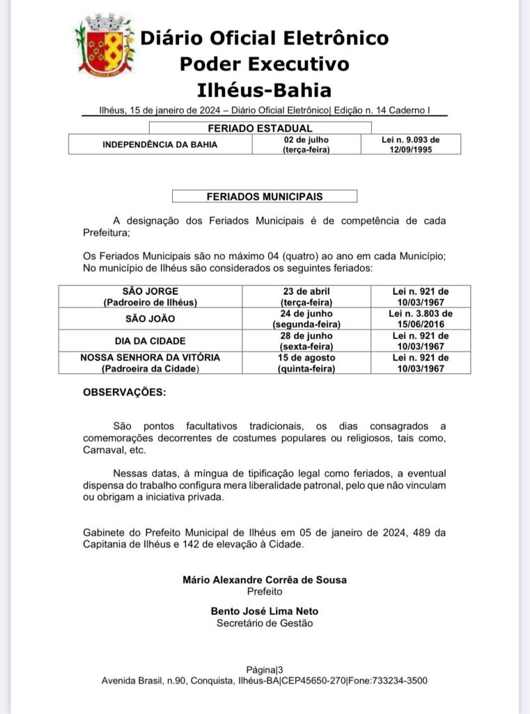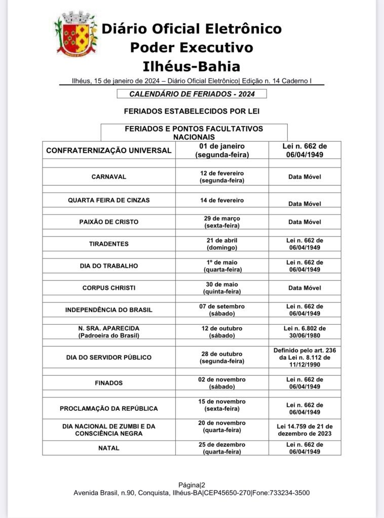 A Prefeitura de Ilhéus informou o calendário de feriados e pontos facultativos referente ao ano de 2024. As datas deverão ser observadas pelos órgãos e entidades da administração pública municipal direta e indireta, sem comprometimento das atividades públicas que englobam serviços considerados como essenciais.