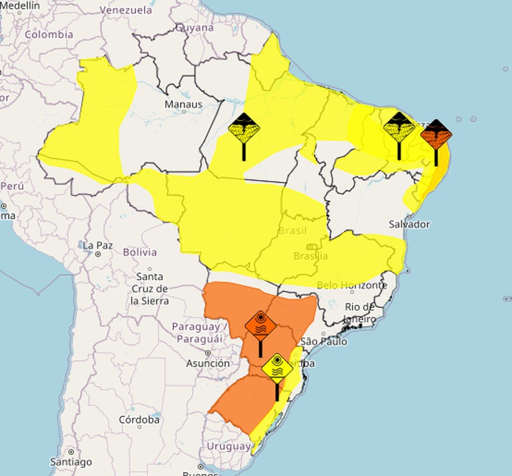 Além disso, o órgão também alerta para chuvas intensas em parte do Norte, Nordeste, Sudeste e Centro-Oeste. Uma mancha laranja, espalhada pelo litoral do Nordeste até às 23h59 de quarta-feira, indica que pode chover entre 30 e 60 mm/h e ventos de até 100 km/h. Também há risco de corte de energia elétrica, estragos em plantações, queda de árvores e alagamentos. Neste caso, o órgão recomenda que em caso de rajadas de vento, evite se abrigar debaixo de árvores, pois há possibilidade de queda e descargas elétricas.